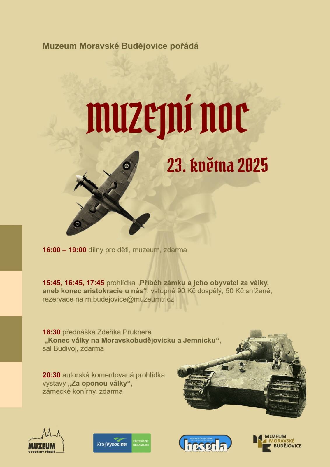 V pátek 23. května začala muzejní noc komentovanými prohlídkami zámku, které se zaměřily na život zámeckých obyvatel ve válečných letech. Součástí muzejní noci byly dílničky pro děti, kde si děti mohly vyrobit dva druhy letadel. Hlavním vrcholem se stala přednáška badatele a publicisty Zdeňka Pruknera, který přednášel o konci války na Moravskobudějovicku a Jemnicku. Program zakončila komentovaná prohlídka výstavy Za oponou války v zámeckých konírnách.